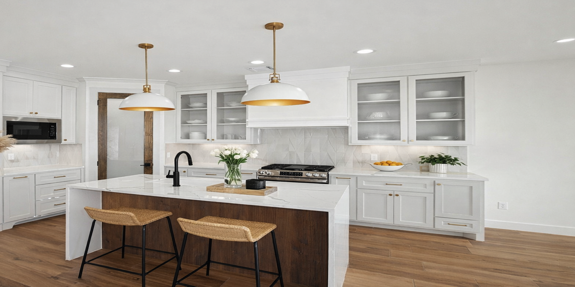 The living room makes a striking first impression with a vaulted ceiling and cozy wood-burning fireplace, creating a bright, open space that still feels warm and welcoming. The open kitchen flows effortlessly from the living area and showcases modern fluted accents, warm neutral color palettes, and a statement waterfall-edge island—perfect for gathering, entertaining, or casual family meals. Modern light fixtures throughout the home add a clean, contemporary finish.